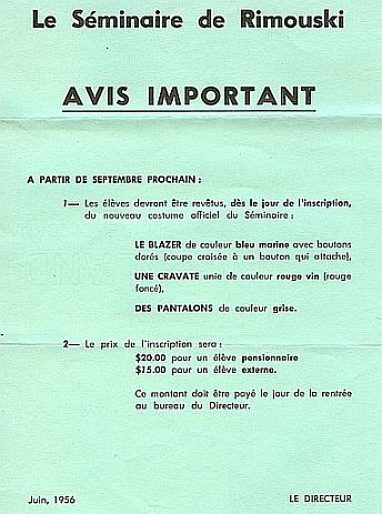 Après avoir réussi la première épreuve du baccalauréat, nous avions accès aux belles-lettres soit l’étude de la valeur littéraire de textes (littérature, prose, poésie). Or, en 1956, à notre cinquième année au séminaire, survint un grand changement : la disparition de la redingote. En effet, en juin, nous avions reçu un avis décrivant le nouveau costume. À l’entrée, au lieu de la minijupe, les étudiants portaient pantalon gris et