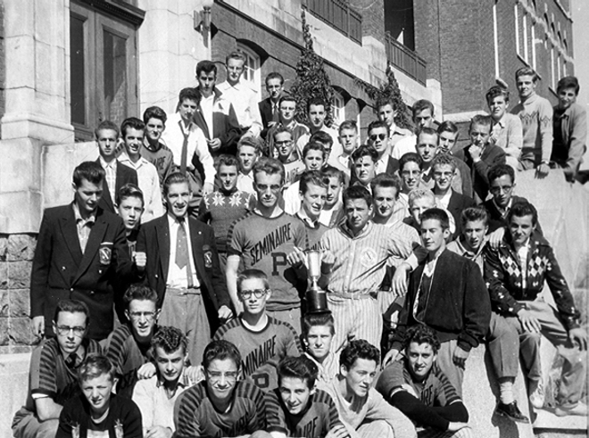 La photo ci-dessous illustre bien ce rassemblement autour du trophée. Nous étions la classe qui avait triomphé grâce aux exploits de quelques uns d’entre nous. C’était comme si nous avions tous participé ! Sur la photo, il manque Charles Gagnon, Gilles Joubert, Paul-Arthur Gendreau (des externes…) et le photographe évidemment, Richard Joubert.