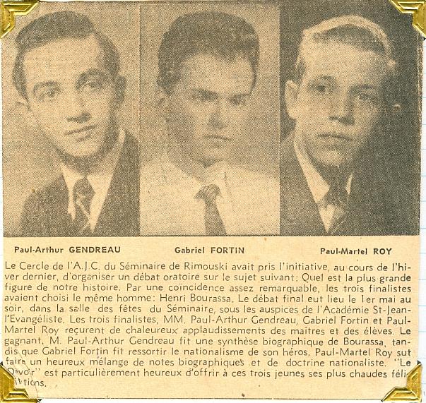 Le mercredi 18 avril 1956, cinq jeunes orateurs de la Versification prenaient part au concours d’art oratoire organisé par l’A.J.C. : Jean-Yves, Guy, Roger, Paul-Martel, Michel-André. Puis le 24, Paul-Arthur et Marius complétaient les présentations. Le lendemain la semi-finale du concours mettait en liste quatre candidats de la versification : Guy, Jean-Yves, Paul-Arthur et Paul-Martel. Gabriel Fortin, du 96e cours, remporta la palme suivi de Paul-Arthur et Paul-Martel. À la grande joie des versificateurs, lors de la grande finale du premier mai, Paul-Arthur sortit vainqueur suivi de Gabriel Fortin et de Paul-Martel. Un journaliste du Devoir, de passage à Rimouski, assista à cette finale et le 24 mai apparaissait l’article suivant dans Le Devoir.